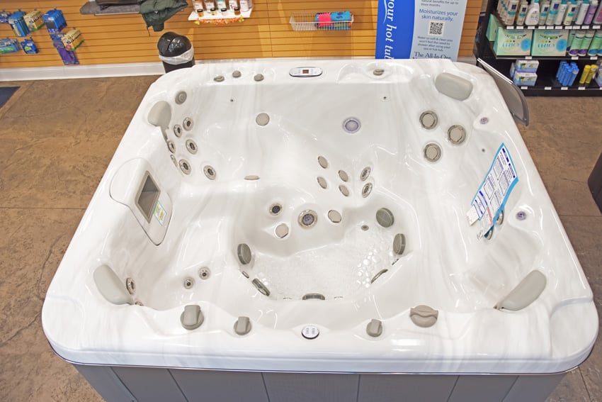 Spa features weir activated top loading skimmer, built-in headrest pillows, stainless steel jet accents, 7/5/5 warranty, satellite controls and more.